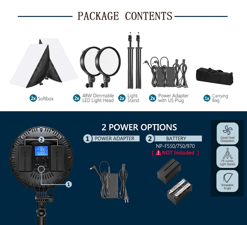 *Package Contents: VISICO Softbox with 48W LED Light Head 2-Pack, Two Light Stands, Two Power Adapters, Carrying Bag.