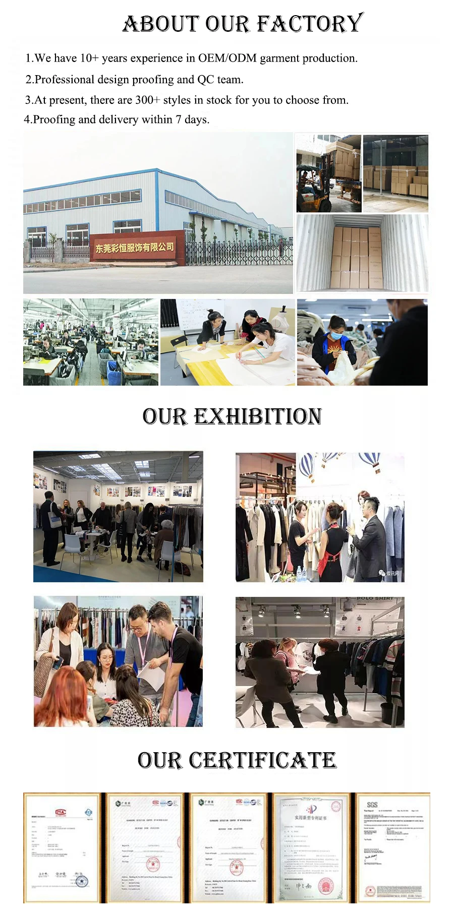 We are the source garment factory in China. Quick sample production and product quality control are our biggest advantages. | ||||||||