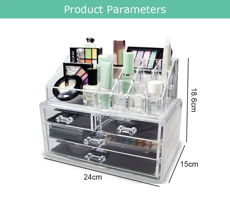 Advantage | 1.Interlocking and stackable design fit to other drawers so that you can DIY your own makeup organizer. You can also stack more drawers on buttom of the base or use them separately 2.Compartments of various shapes and sizes will accommodate your cosmetics and jewelry. Have all your lipsticks, compacts, nail polish, brushes, jewelry and more all neatly organized. | ||