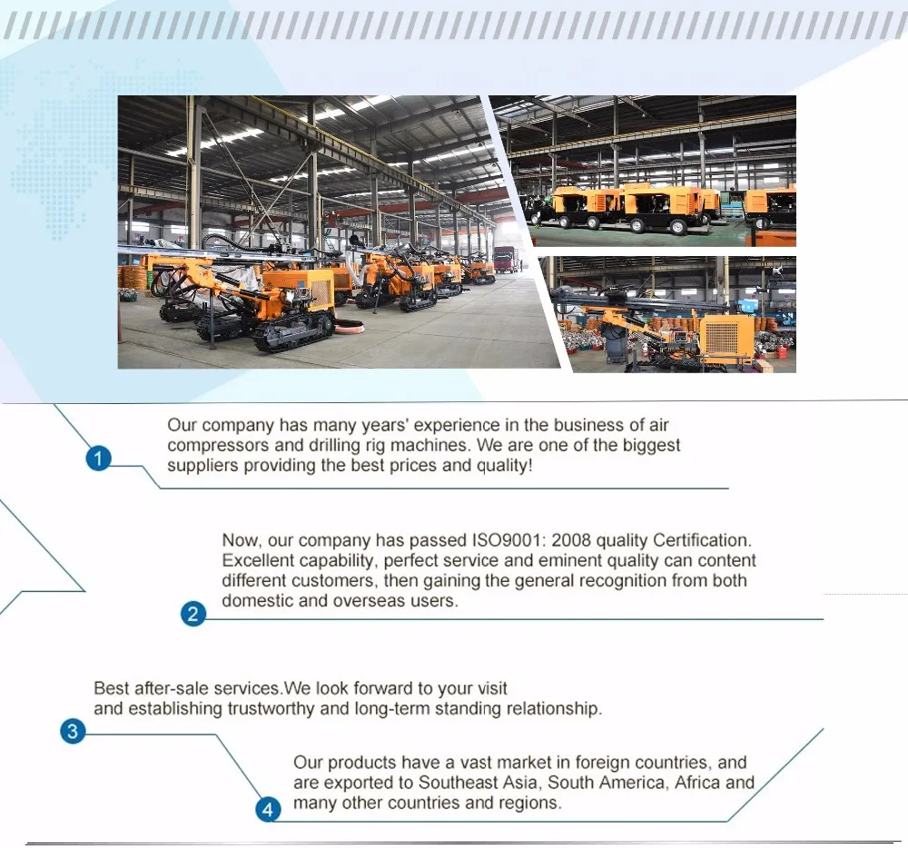 Our company provide more than 20 kinds products, which including piston air compressors, screw air compressors, drilling rig machines, drill bits, drill rods, DTH, air picks, rockdrills, down the hole drills, small mining piston air compressors, chiller air compressors, and concretespraying machines. Meanwhile, we own independent rights of import and export. Our products have a vast marketin foreign countries, and are exported to Southeast Asia, South America, Africa and many other countries and regions, Our company has been committed to providing good after-sale service and best quality to meet domestic and overseas users demands.