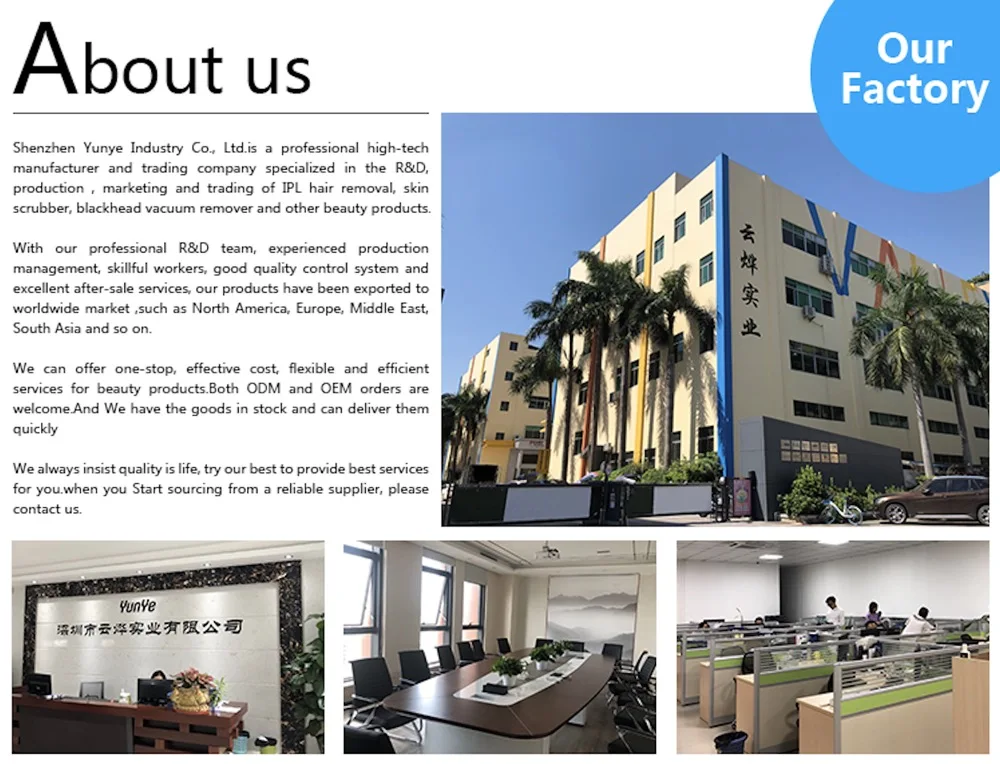 Shenzhen Yunye Industry Co., Ltd.is a professional high-tech manufacturer and trading company specialized in the R&D, production , marketing and trading of IPL hair removal, skin scrubber, blackhead vacuum remover and other beauty products.With our professional R&D team, experienced production management, skillful workers, good quality control system and excellent after-sale services, our products have been exported to worldwide market ,such as North America, Europe, Middle East, South Asia and so on.We can offer one-stop, effective cost, flexible and efficient services for beauty products.Both ODM and OEM orders are welcome.We always insist quality is life, try our best to provide best services for you.Start sourcing from a reliable supplier, please contact us.
