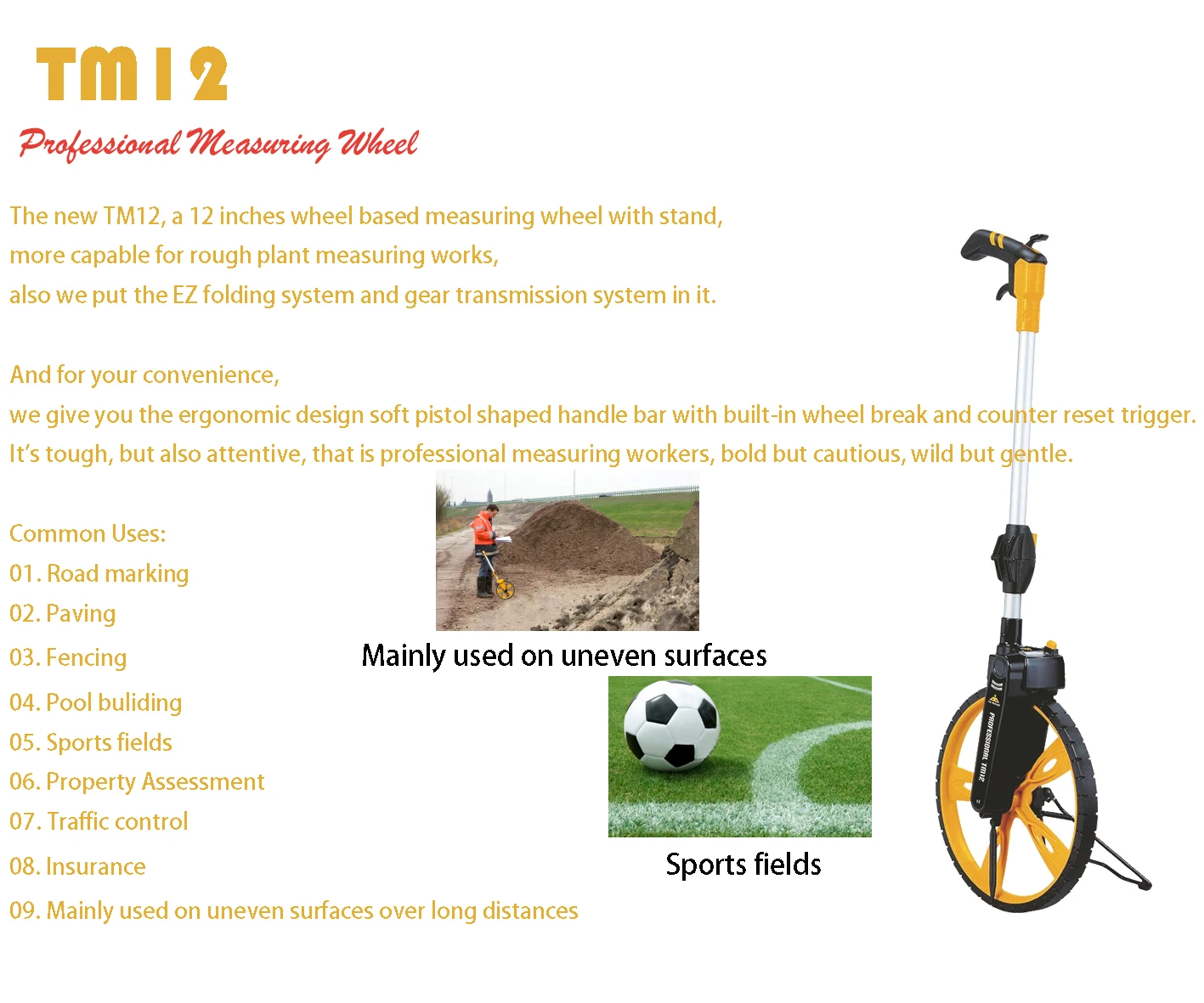 Measure up to 9999.99 meters | High Traction Flat PU tire mounted onto Rim | |