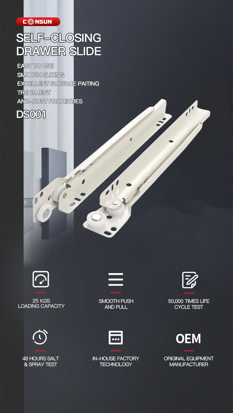 Product Name | Powder Coated Roller Slide, Soft Closing Drawer Guide Slide | Application | office furniture, kitchen cabinet, or home drawers. |