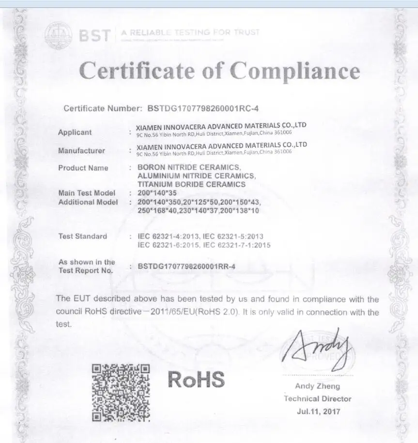 For the standard products, like ceramic substrate and insulating rods, delivery time is normally 7 working days. For hot pressed boron nitride and machinable glass ceramic, it's about 10 working days. For customized products made of alumina, zirconia, boron carbide and silicon nitride, total producing time is about 30-45 working days.