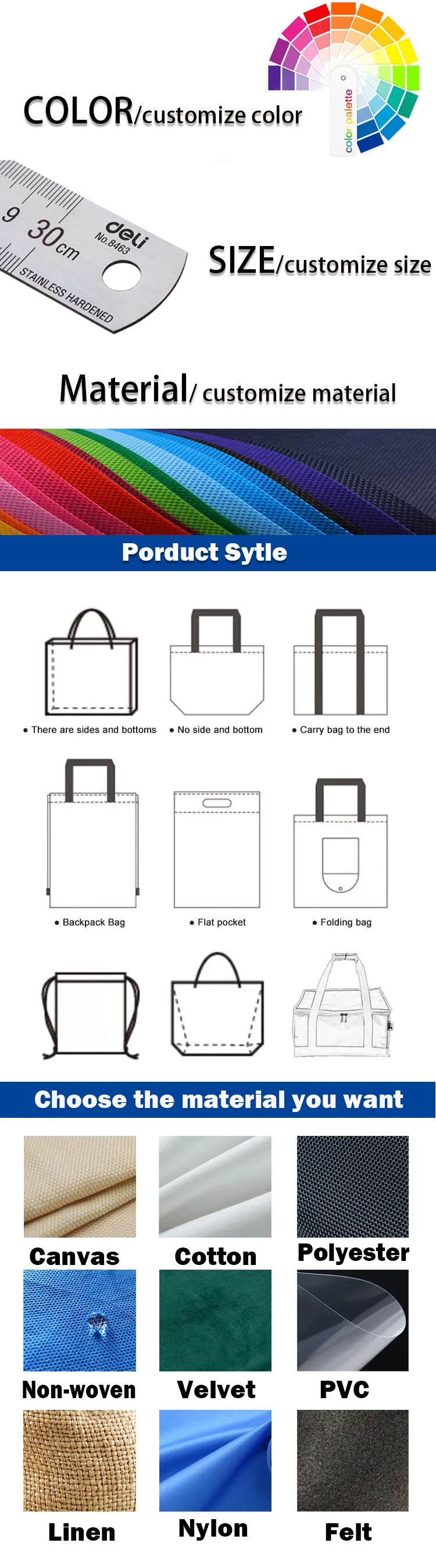 A:We specialize in polyester,non-woven, nylon, RPET, cotton, canvas, jute, felt,velvet,bamboo,and other environmentally friendly materials bags, including a variety of styles, shopping bags,gift bags, promotion bags,tote bags,drawstring bags,dust bags,foldable bags, cosmetic bags, storage bags, cooler bags,garment bags,aprons and ultrasonic bags.