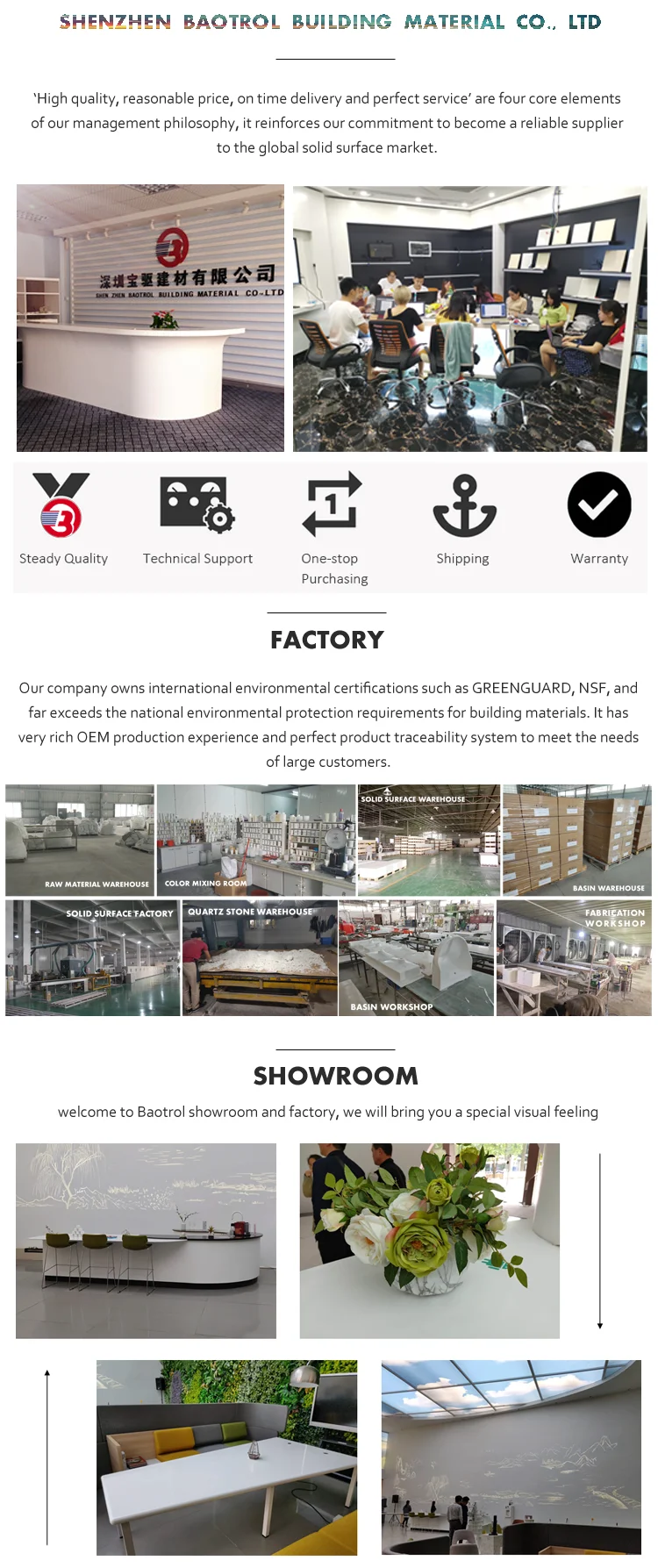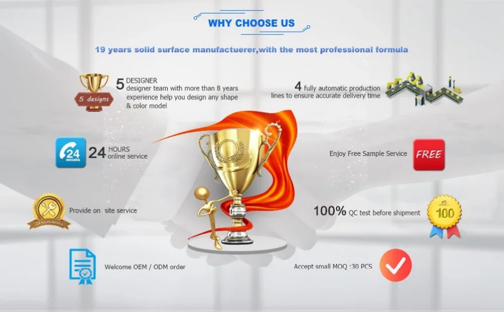 We produce solid surface in our own factory. We never cut cost by comprimizing on quality. Instead, our experienced team can always help our clients figure out the best design. Thus the unnecessary parts are removed, the inappropriate fixed and the extra money saved.