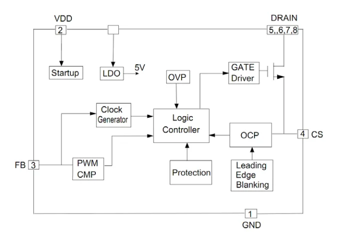 Drain | HV MOSFET drain pin. The drain pin is connected to the primary lead of the Transformer. |