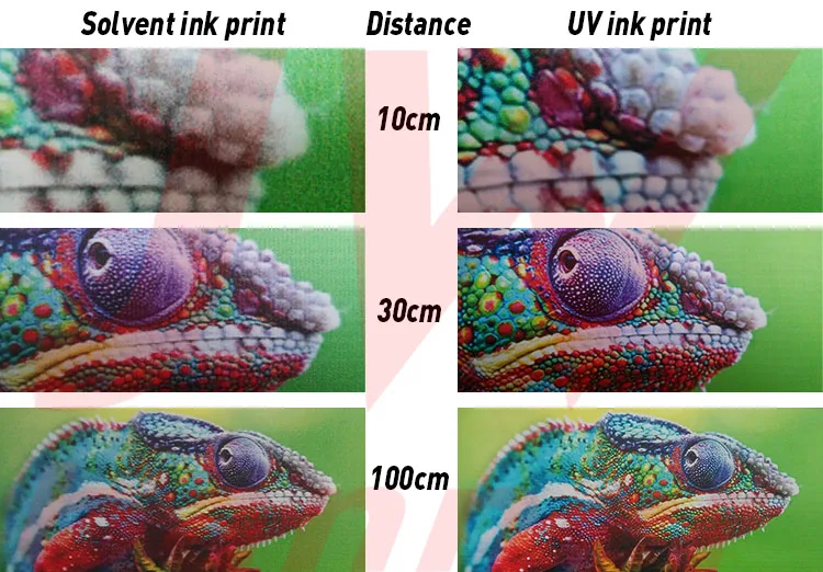 Seen from photos, UV ink print has better printing effect than solvent ink printing, price is also much higher, if you request high printing quality and long lifespan, please select UV print, color could lasts over 5 years outdoor. If you banner is big, it looks not much difference when see the banner from meters away, then solvent ink printing is a good option, it is much cheaper and lasts 2 years outdoor.