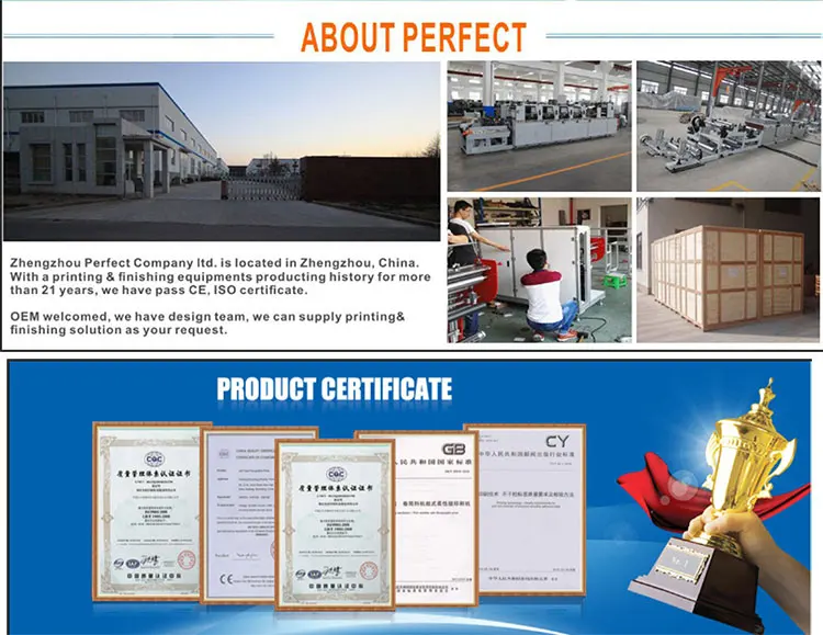 Zhengzhou Perfect Co., Ltd. is a manufacturer of paper processing machinery with well-equipped testing facilities and strong technical force. Our main products including automatic roll die cutting and creasing machine, automatic paper carton erecting machine, automatic paper cup making machine and orhter paper food containers making machine. With a wide range, good quality, reasonable prices and stylish designs, our products are widely recognized and trusted by users and can meet continuously changing economic and social needs.