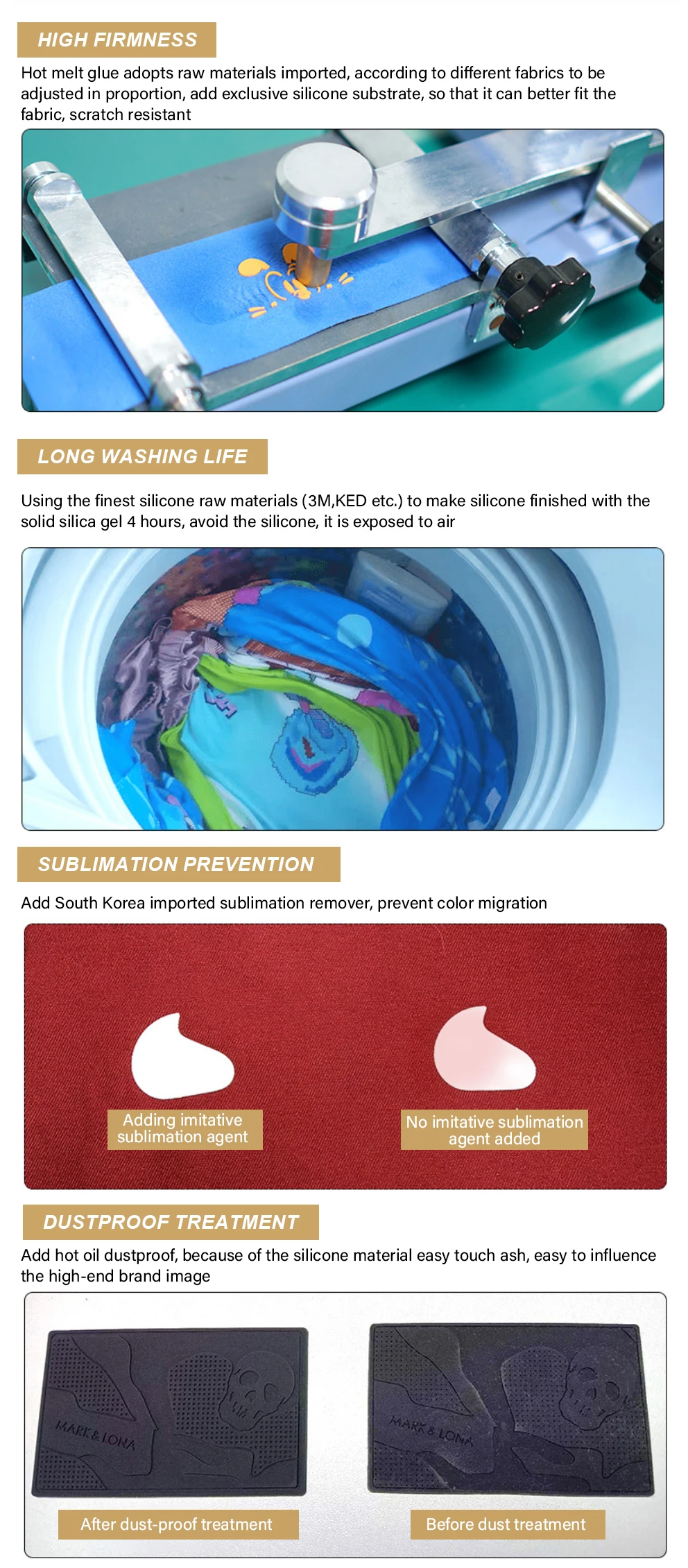 Technics | Printing: Screen Printing, High Density Silicone (Rubber) Transfer Printing etc. Transfer Temperature : 140°C-160°C Transfer Pressure: 4-6kg Press Time: 5-15S Tearing Method : Hot or Cool Peel 2 Kinds of Choice Our Professional, Your Satisfaction. |
