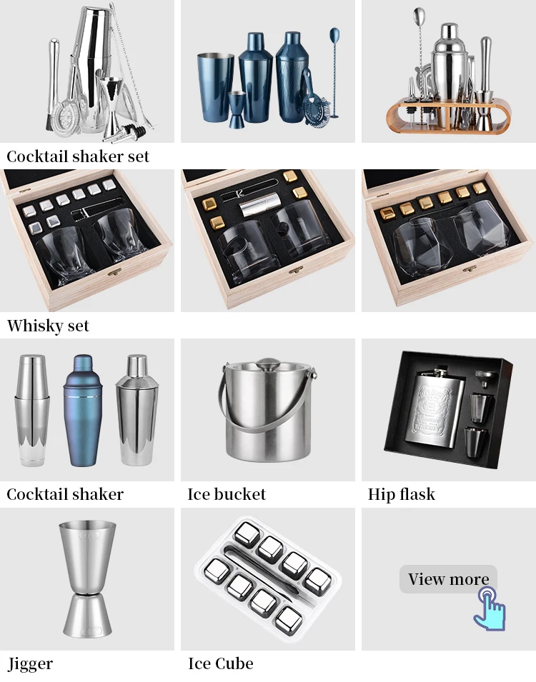 products have below classifications:cocktail shaker set;whisky set;ice bucket;cocktail shaker;Hip flask;Jigger;Ice cube;bar tools. you can choose any items in one set.view more