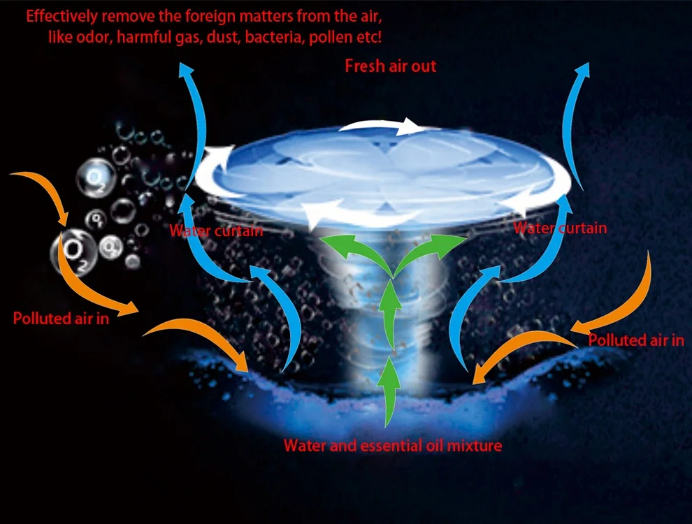 Has an impeller to drive the air flow to pass through the water curtain, so that the foreign matters in the air would be carried away by the water curtain, only the clean air can pass through the water curtain.