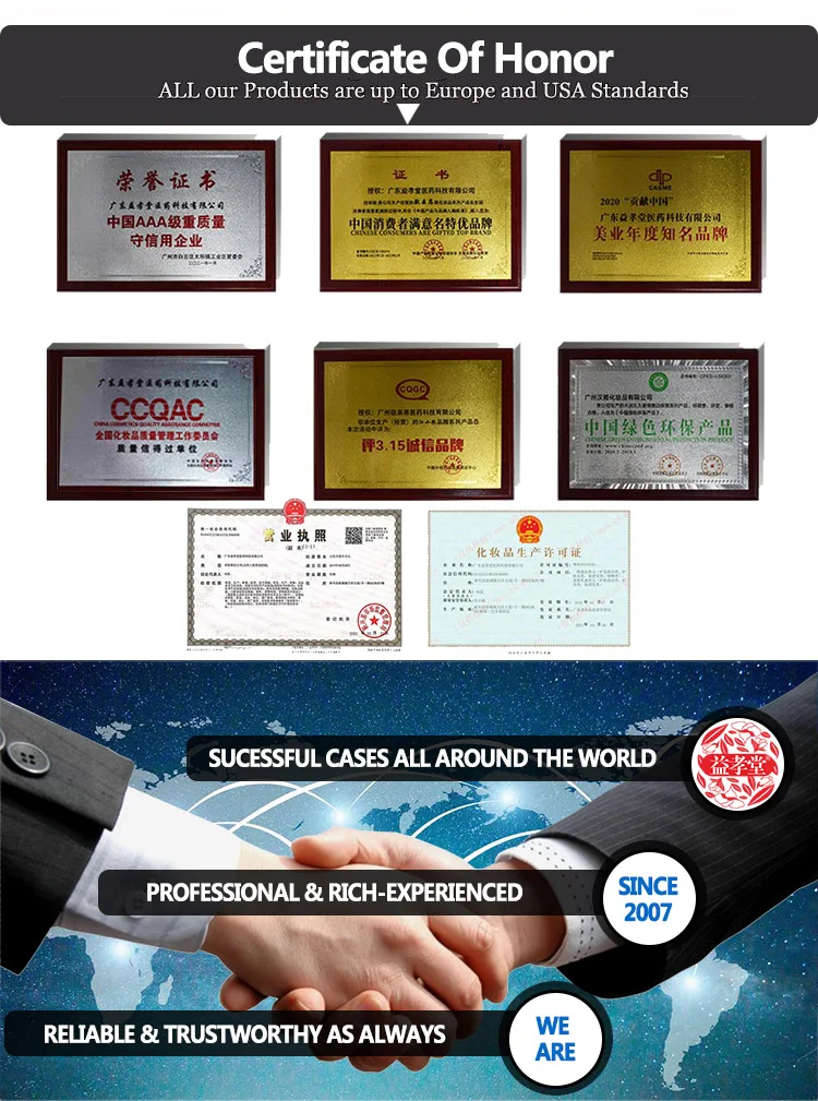 We have a 16-years, have an independent research and development center, and the raw materials are from Europe, America and Thailand. The products are sold to more than 100 countries around the world. We have GMP ISO22716 ISO9001 quality management