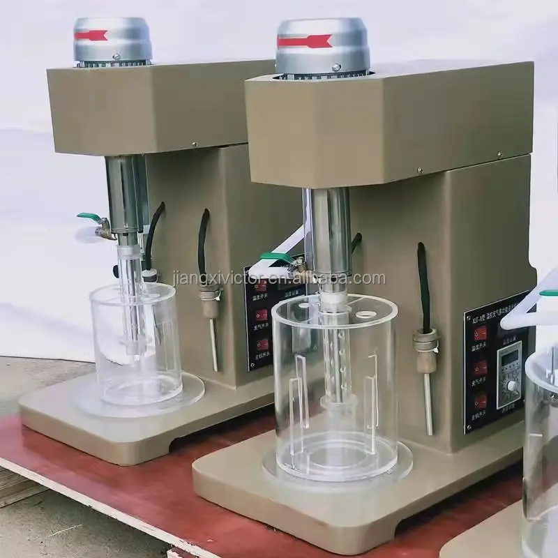 Before operation, check whether the main shaft turns clockwise. If not, then change phase sequence of the power source to make the motor turns clockwise before operation. Mix mineral samples and water and then pour them into the cell. Start up the motor to drive the main shaft for rotation. The impeller will agitate in the cell. Then open the valve for air inflation and add chemical agent to form foams. Turn on switch of the scraper motor (8) for rotation of the scraper to scrape foams out of the cell. A box is set on the working table to receive foams. Minerals needed can be obtained after processing of the foams.