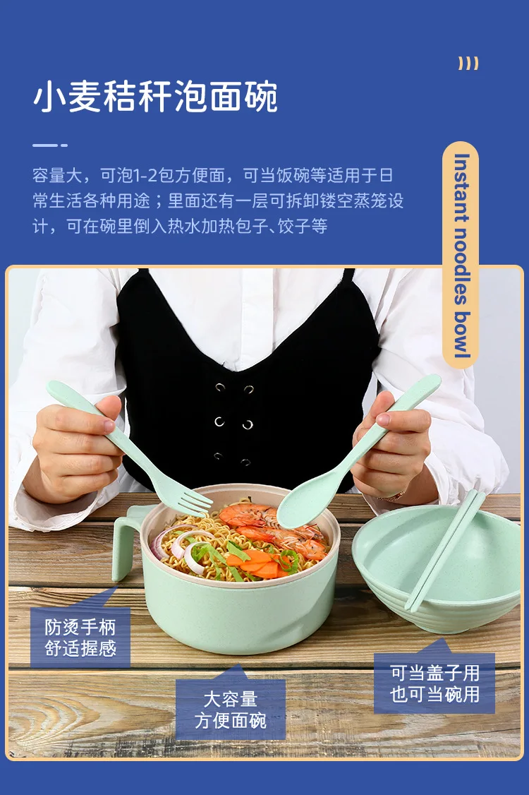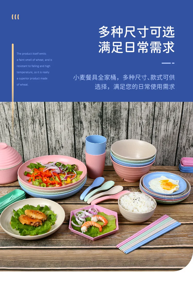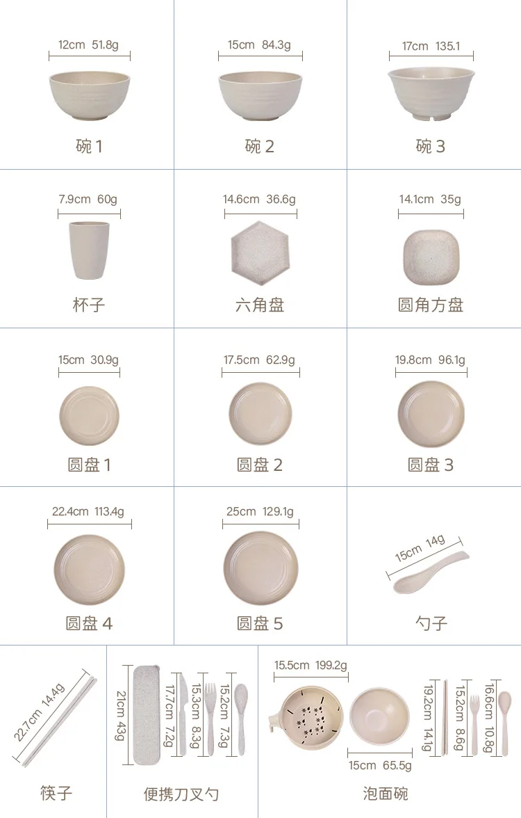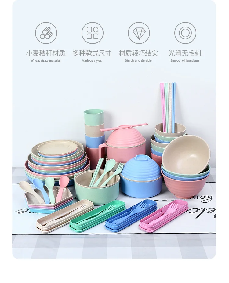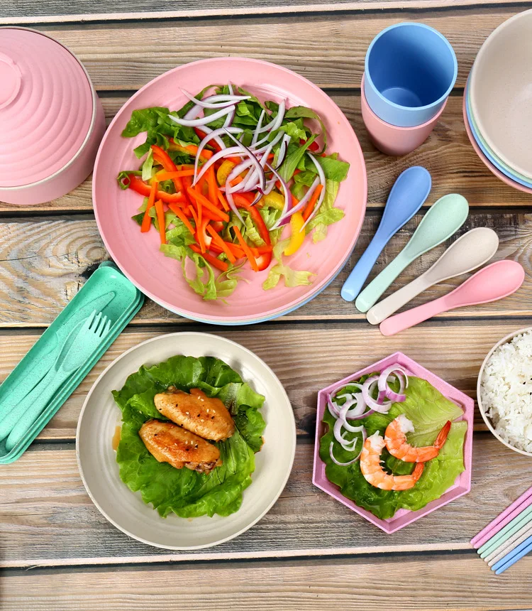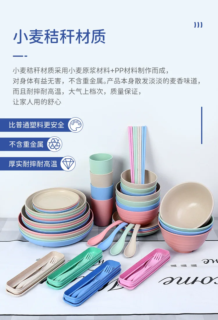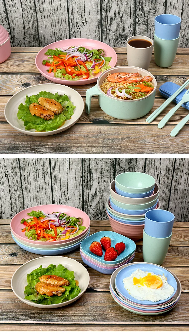 Wheat Straw Portable Tableware Set Plate Household Bone Dish round Square Plate Water Cup Rice Bowl Chopsticks Spoon Cutlery Set