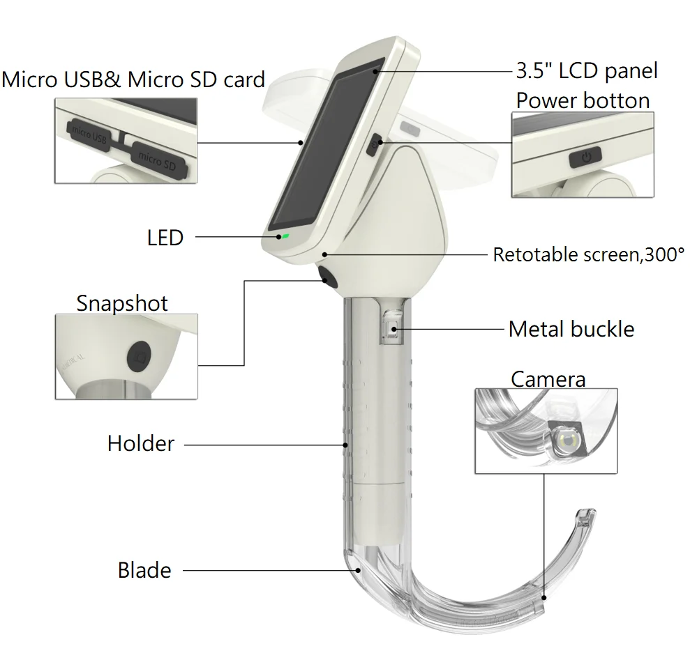 Micro USB interface | This interface has two functions. First, a Micro USB cable can be connected for battery charging. Second, a Micro USB to RCA transmission cable can be connected to display the real-time image of laryngoscope on the TV screen. |