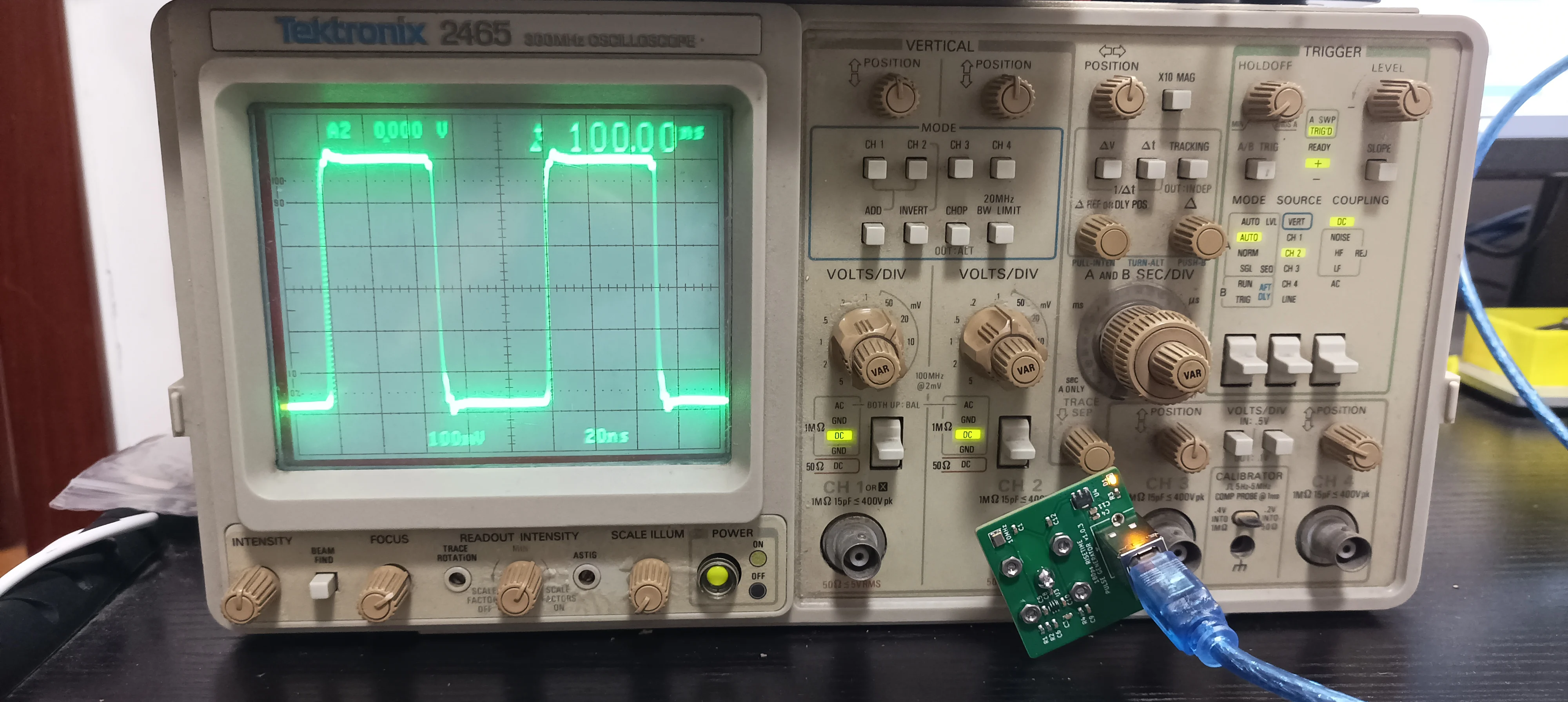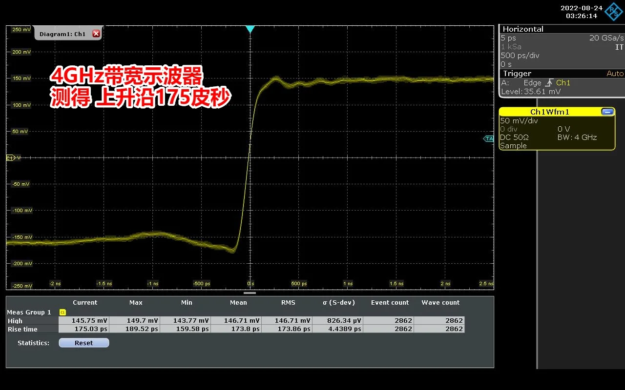 When the rise time of the oscilloscope itself is lower than 180 ps, the measured rise time is greater than 180 ps. When the bandwidth of the oscilloscope is greater than 2GHz, the rise time of this module will be measured to be about 180 picoseconds.
