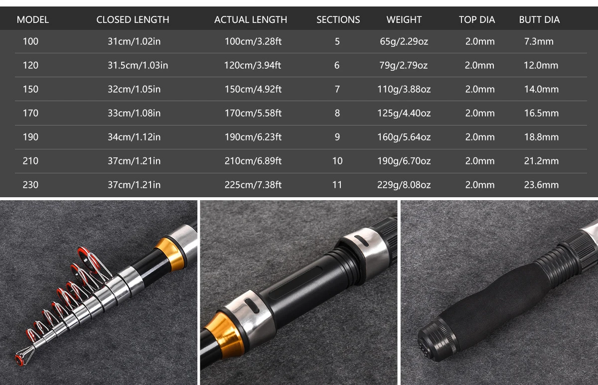 Model CLOSED LENGTH actual length sections weight TOP DIA BUTT DIA