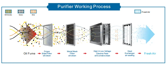 JingPing Environmental Protection Co., Ltd is a professional manufacturer of Integrated Oil Fume Purification Machines, which are the most advanced All-In-One Commercial Range Hood on the market. With maximum eight layer filtration process, it can reach up to 99% purification rate by removing grease, oil, smoke and odors in addition to heat & moisture. After purification and filtration process, the fresh air just comes out from the air outlet. There will be NO MORE DUCTS required in your kitchen!