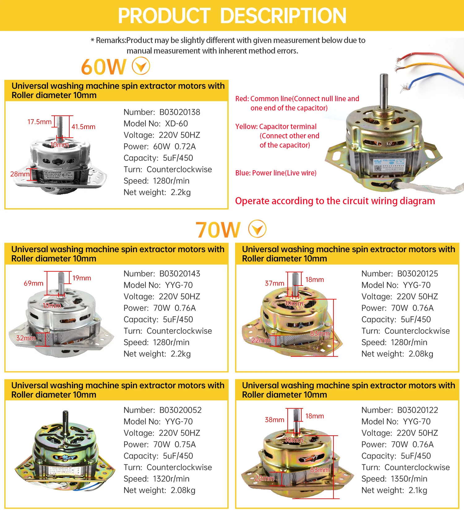 B03020125 | Washing machine spin motor | 70W | 220V | 50Hz | 10mm | Aluminium wire | 1280r/min | 5μF/450V |