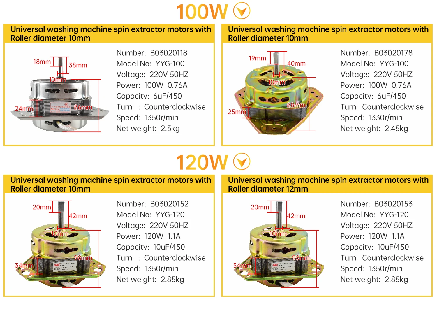 B03020118 | Washing machine spin motor | 100W | 220V | 50Hz | 10mm | Copper wire | 1350r/min | 6μF/450V |