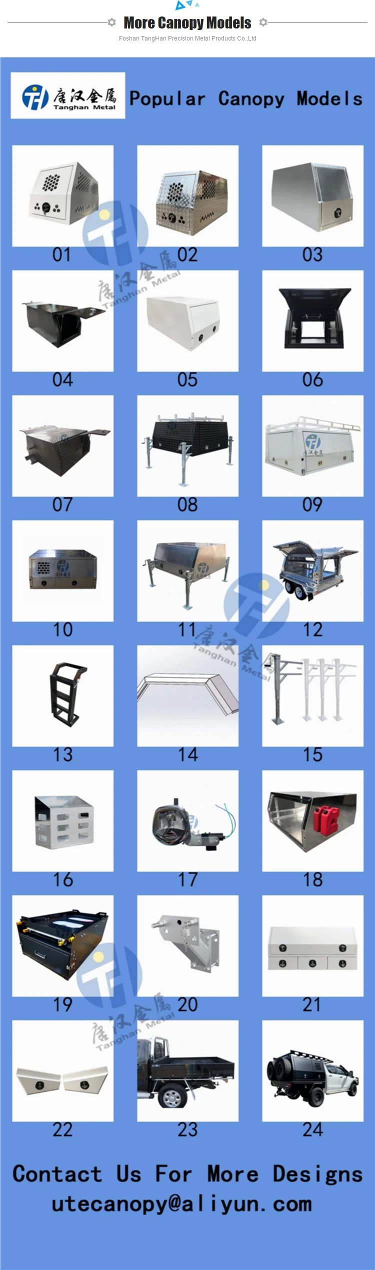Foshan TangHan Precision Metal Products Co., Ltd was established in 2008,Located in Foshan , Guangdong province .As a comprehensive metal sheet fabrication manufacturer,we researched and developed lots of custom metal products , like metal toolboxes, Ute canopies , dog boxes , valet parking podiums,bumper,roll bars ,engine skid plate, tonneau cover, metal wall cladding panel etc ,mainly used in tools storage ,pickup exterior modification,special purpose vehicle fittings and construction industrial .