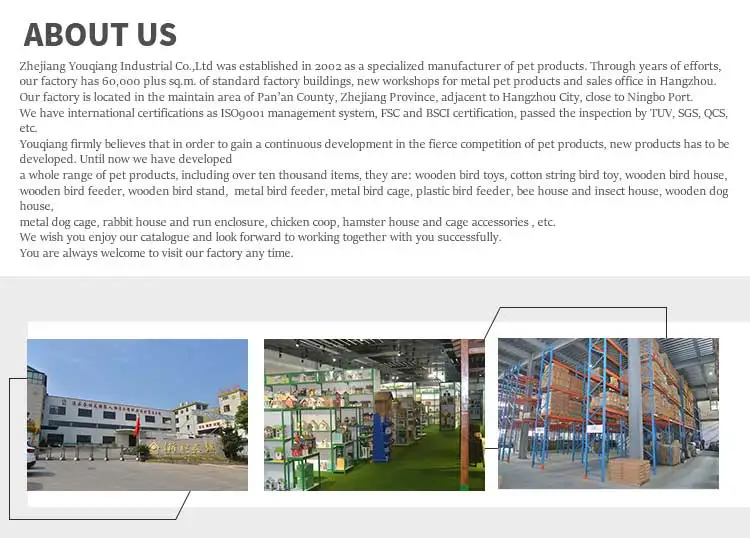 Our corporation was established in 2002 as a specialized manufacturer of pet Products. More than 40,000 plus sq.m. of standard factory buildings,Our sales office in Hangzhou. Certifications as ISO9001,FSC and BSCI,TUV, SGS, QCS, etc.