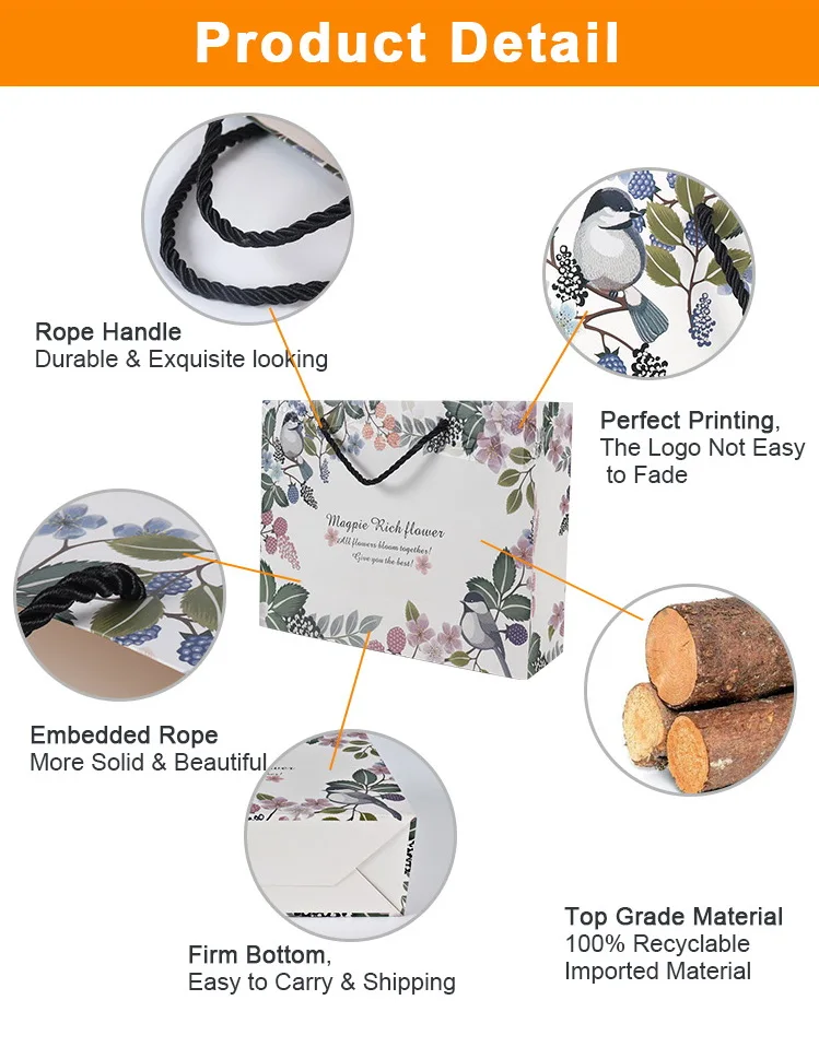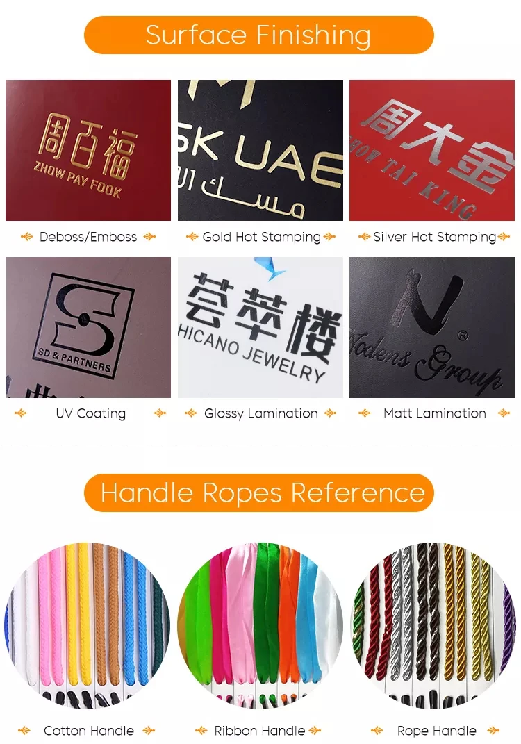 Handle Type | Ribbon Handle, PP Rope Handle, Cotton Handle, Grosgrain Handle, Nylon Handle, Twisted Handle, Flat Paper Handle, Die-cut Handle or Customized Handle |