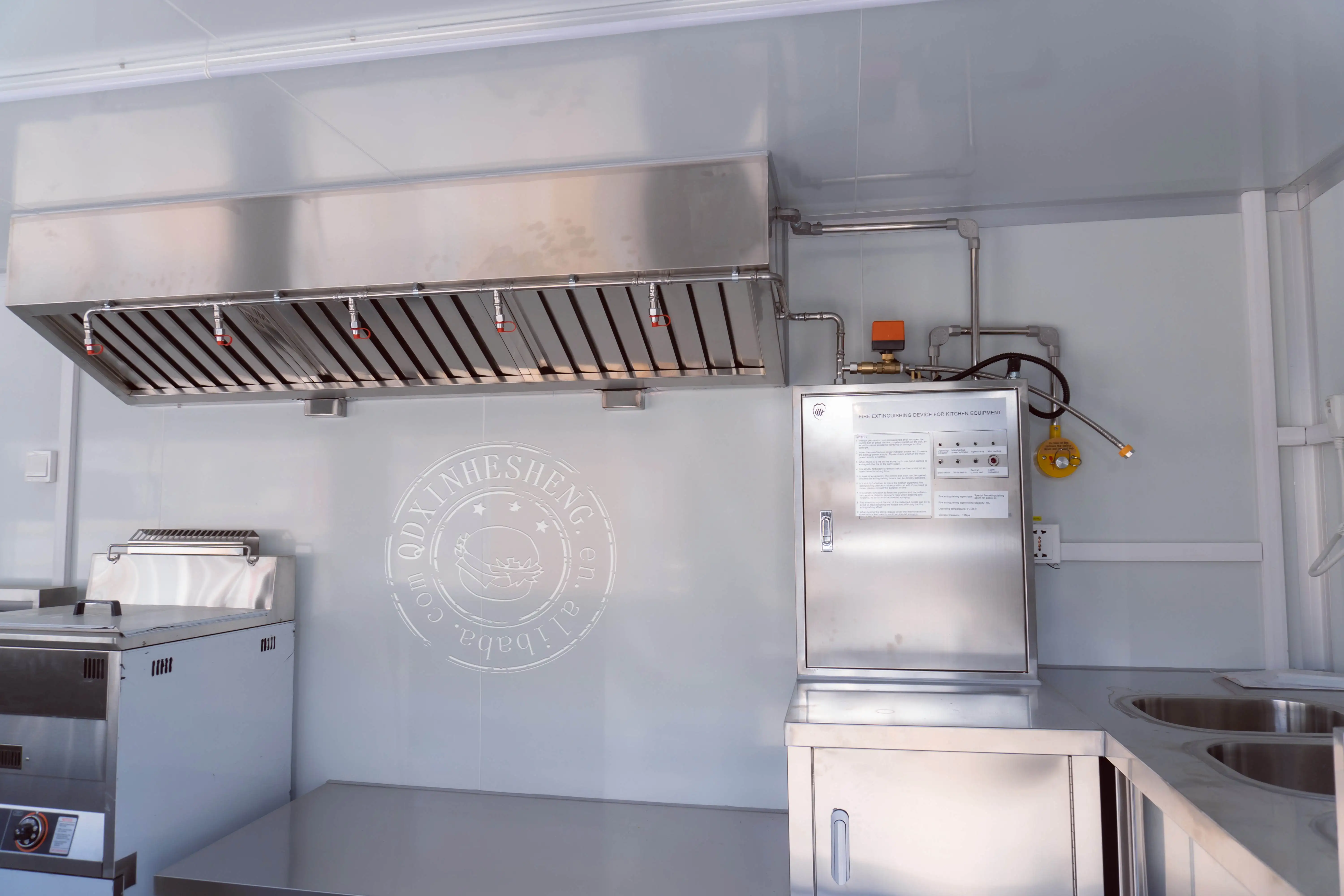Inside the food trailer, the floor drain is located near the sink to facilitate the drainage of water.