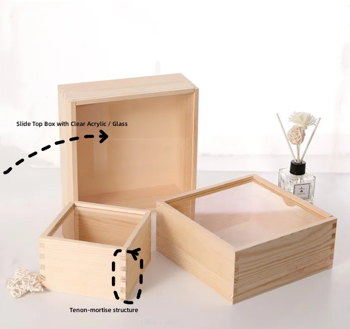 Product Name | Custom Unfinished Pine Wood Gift Packaging Box Wooden Slide Top Box with Clear Acrylic / Glass Sliding Lid |