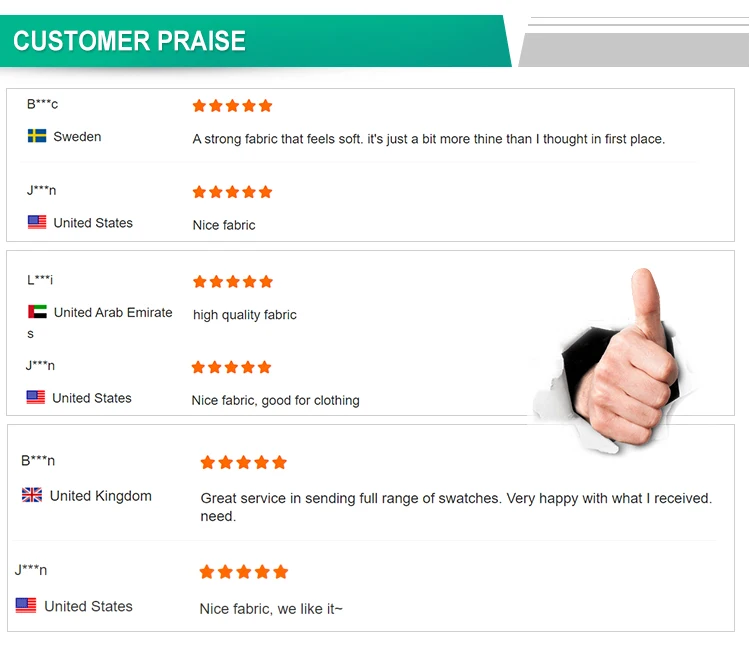 A: 1. We are engaged in developing all kinds of eco-friendly fabrics and have rich experience for many years in textile field. 2. We can supply lots of new designs, customized services including printing and solid designs to our clients constantly. 3. We have great experience on provide high quality service to designers, wholesalers and retails. 4. Manage systematic to control the grey fabric quality. 5. QC checking each step from the grey fabric to the finishing fabric. 6. Every customer is warmly welcomed to cooperate with us, and we are ready to develop new products for you.