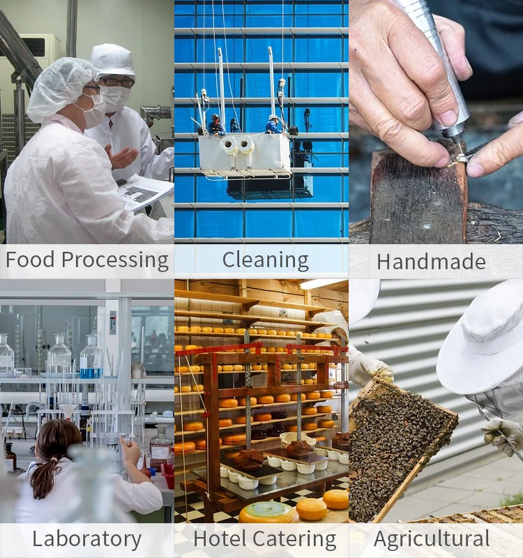 Food processing, hotel catering, family cleaning, tourism dinner, beauty salon, medical chemical inspection, industrial and agricultural work and protection, scientific research, electronic industry.