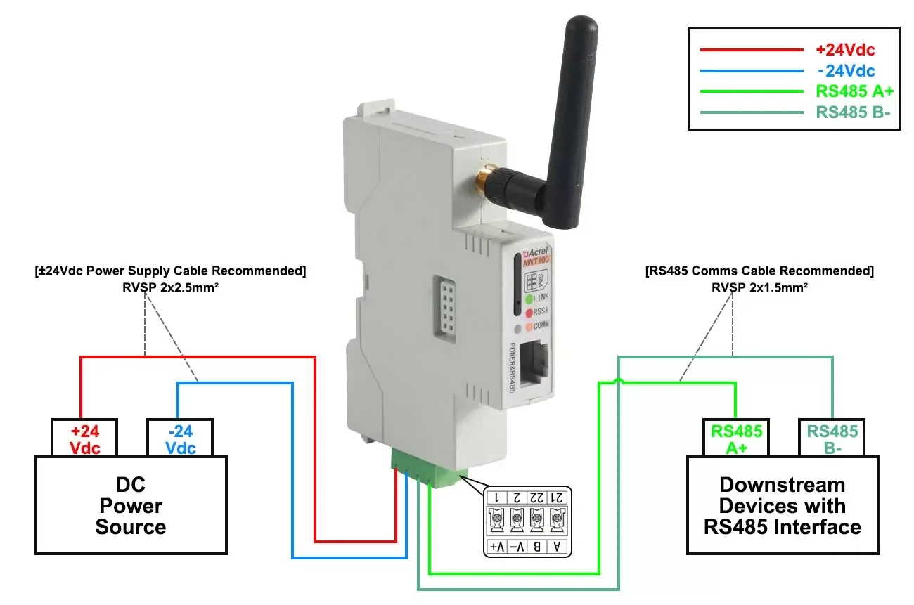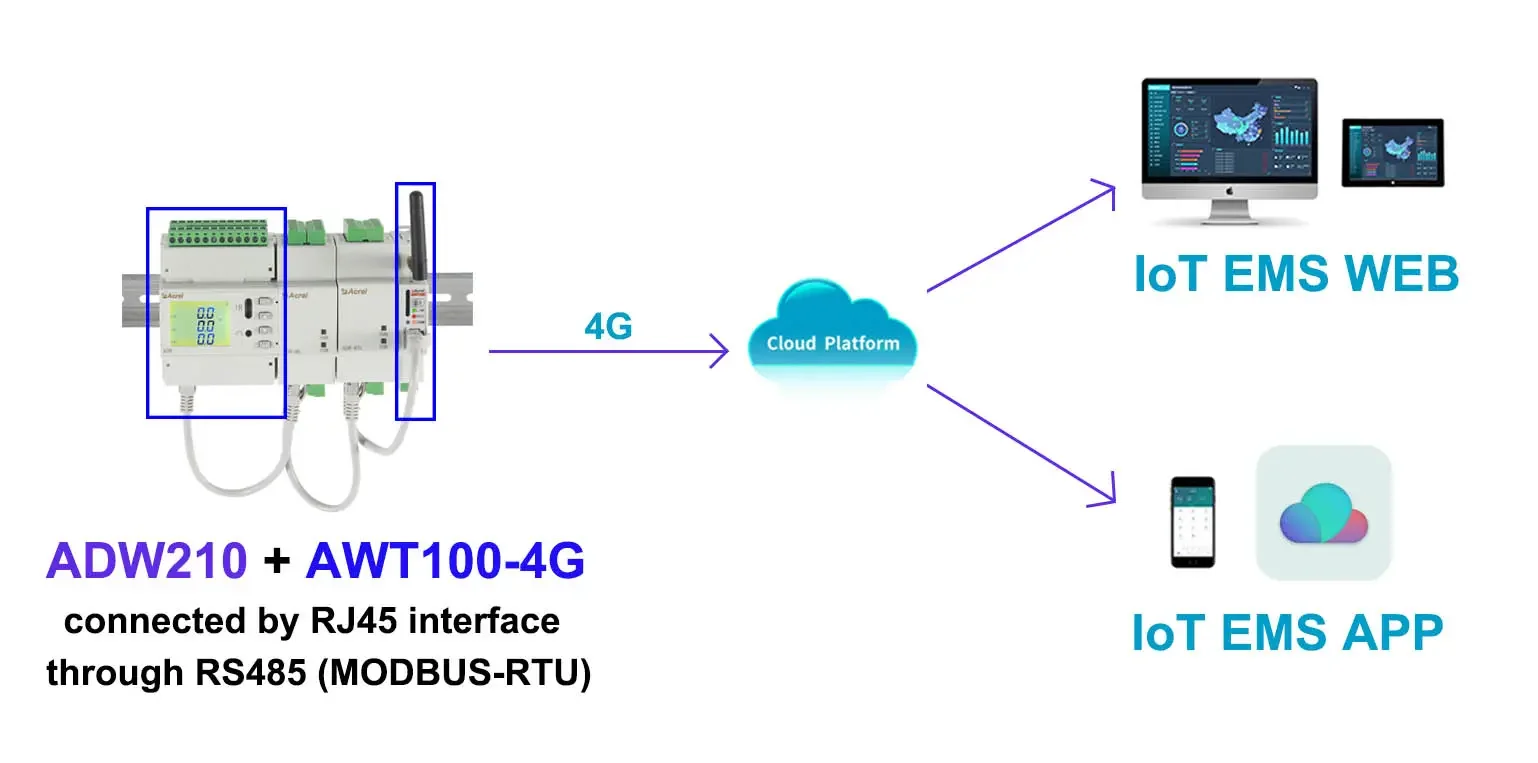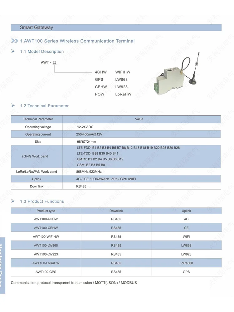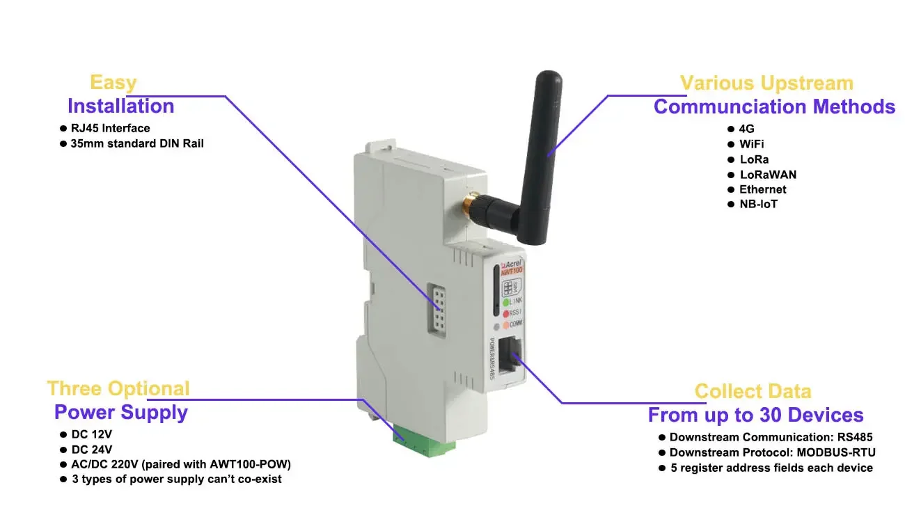 AWT100 wireless communication terminal is a new wireless data acquisition device launched by Acrel. The up link communication includes 2G, 4G, NB, LoRa, LoRaWAN and other communication modes. The down link interface provides a standard RS485 data interface,which can easily connect power meters and RTUs, PLC, industrial computers and other equipment, only need to complete the initial configuration, you can complete the data acquisition of MODBUS equipment; at the same time AWT100 series wireless communication terminal uses a powerful micro-processing chip, with built-in watchdog technology, reliable performance stable.