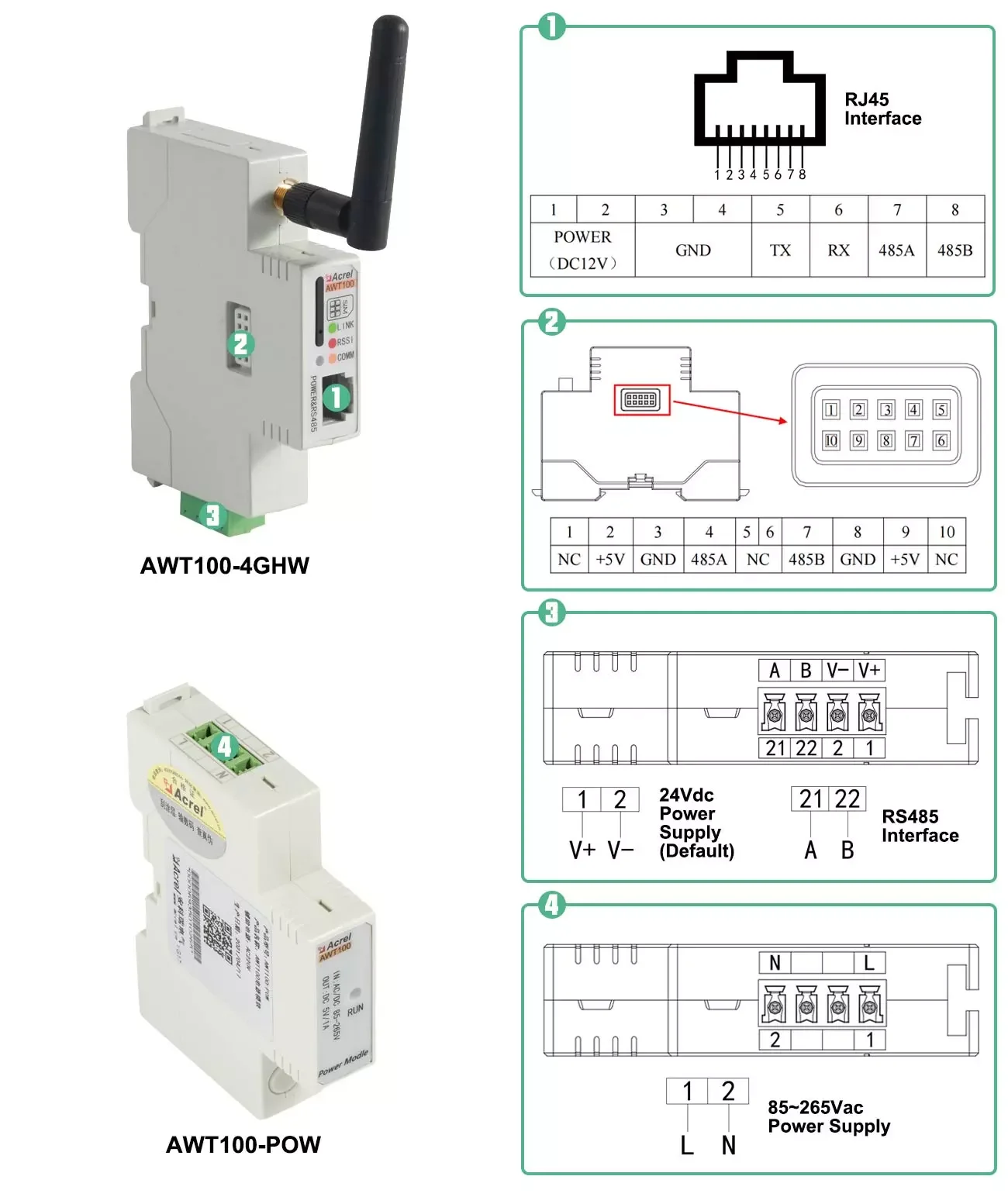 ● Power Supply: 24Vdc (default); 85~265Vac/Vdc (via AWT100-POW Module)