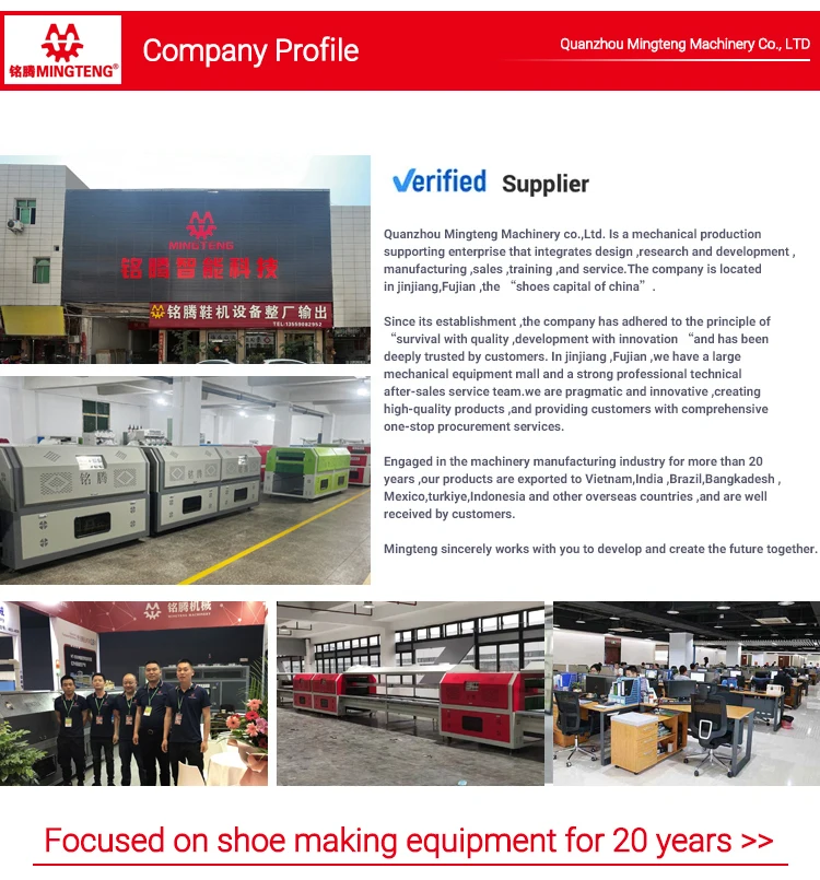 Q1: Are you a manufacturer or a trader? A1 We are manufacturer. We have confidence of both the quality and price. Welcome you to visit our factory. Q2: What's your payment term? A2: Western Union, T/T, E-checking, Credit card,Cash. RMB, Wechat, Alipay, Moneycram, L/C etc. Q3: What's your machine voltage? A3: We can customize the voltage as your request. Like 110v/220/380V/415V,single phase/three phases. Q4: What's your after-sales service? A4: All machines has one year warranty service, any parts damaged (except easy wearing or electronic parts used over 3 months) can be claimed from us.So please feel free to contact with us. Q5: How to install the machine? A5: The normal machines are already installed before deliver.So after receiving the machine,you can directly connect to the power supply and use it. We may also send you the manual and operating video to teach you how to use it. For bigger machines,we can arrange for our senior engineers to go to your country to install the machines.They can give you technical training. Q6: Why can I trust you and place order with you? A6: Our company has more than 20 years making machines experience, so far we have served more than 2000 clients from more than 30 countries/areas. we have a large mechanical equipment mall and a strong professional technical after-sales service team. we are pragmatic and innovative ,creating high-quality products ,MINGTENG offer complete solution for More than 200 shoe factories with comprehensive one-stop procurement services.