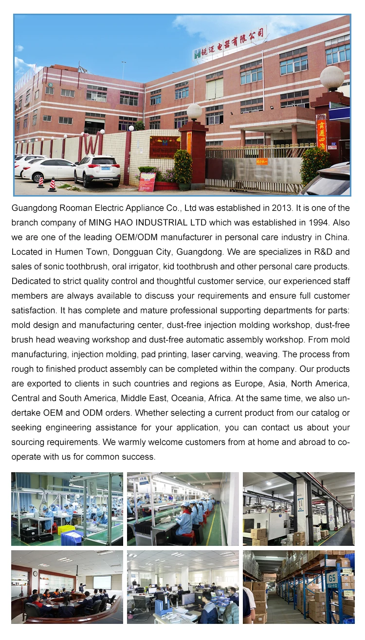 Guangdong Rooman Electric Appliance Co., Ltd devotes to R&D home electrical appliances for over 5 years, with 20,000 square meters workshop, 800 skillful workers. Our main products are Sonic toothbrush, oral irrigator, kid toothbrush and other personal care products.. OEM&ODM are offered.