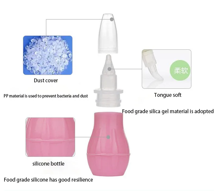How to use: | Press the plastic pump first, insert the nasal aspirator into the nostril of the baby, and then relax the rubber pump to suck out the nasal discharge. It is recommended that you use it after the baby is asleep. |