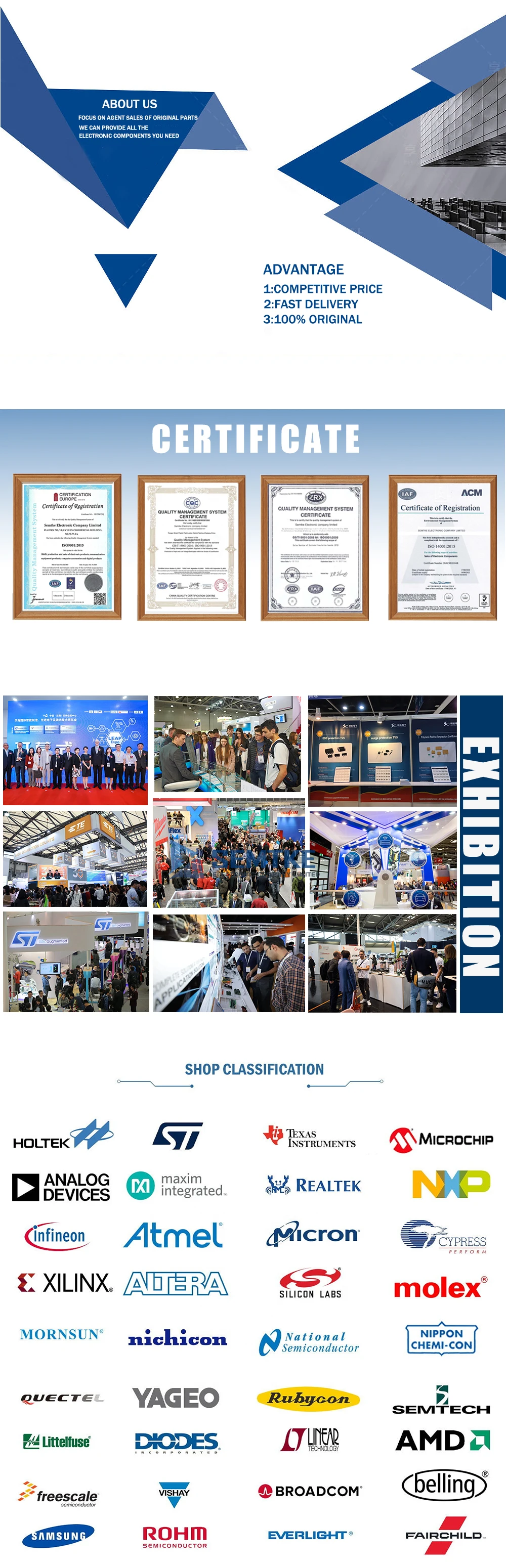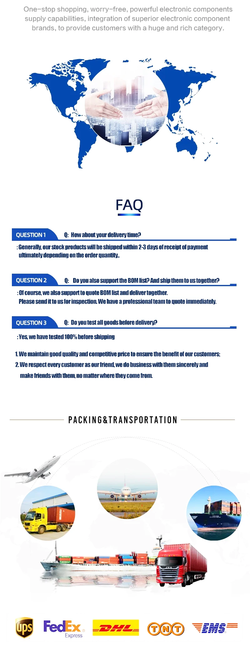We are a supplier company of electronic components with more than 12 years of industrial experience, we can provide you with professional knowledge and excellent quality products, a large number of well-known brand integrated circuits, transistors, capacitors, resistors and other products. We offer one-stop service of electronic components procurement ~~ We regard every customer as a friend, no matter where customers are from. We do business with sincerity and cautiousness. It's our honor to provide service to our customers and make friends with them. |