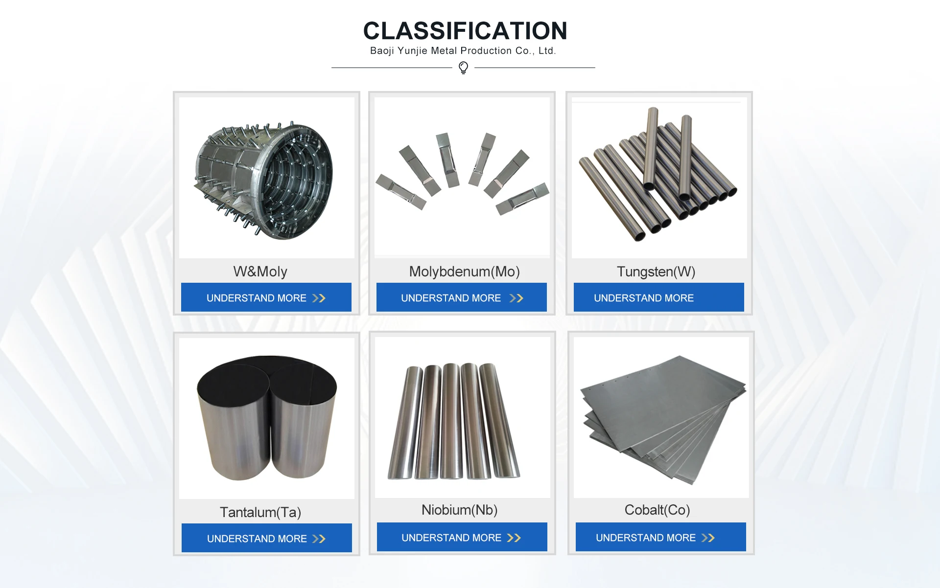 Baoji Yunjie Metal Production Co., Ltd.specializes in the production and management of non-ferrous metals including titanium molybdenum, zirconium, niobium,etc.