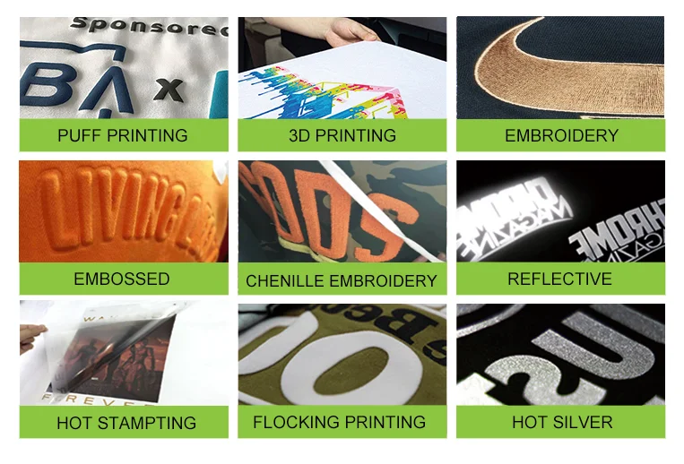 Logo technics | Silk screen printing, sublimation printing, puff printing, embossed printing | ||||||