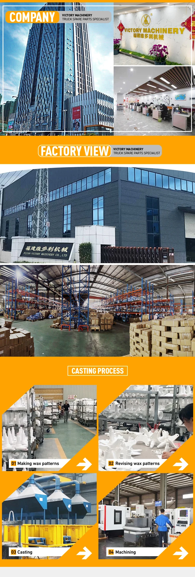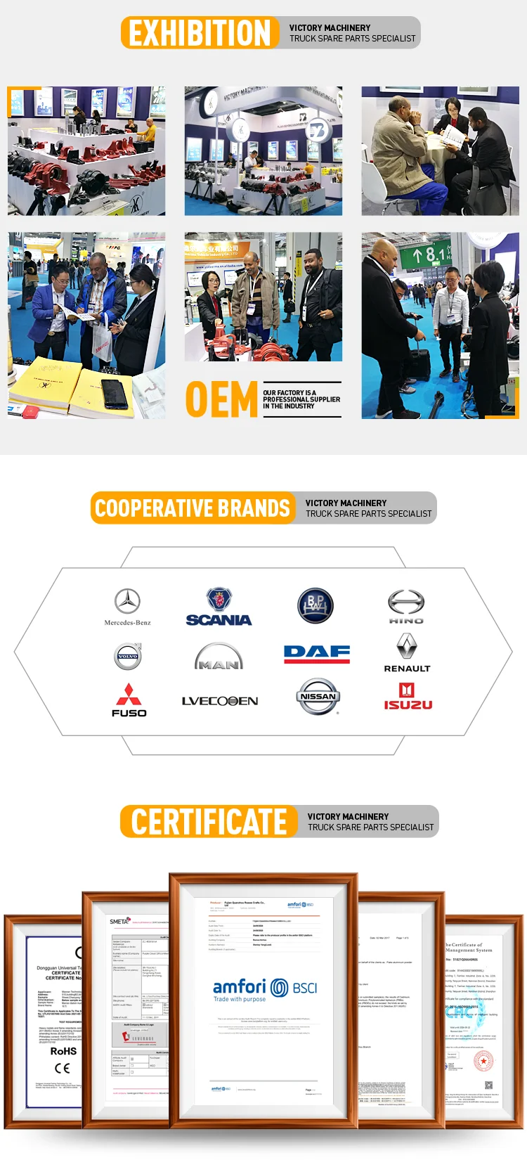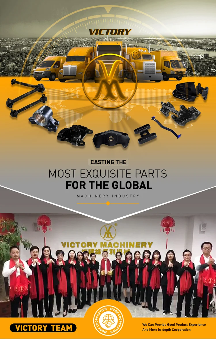 Fujian Victory Machinery Co.,Ltd.a professional manufaturer of Spring Bracket,Shackle,Spring Mounting,Torque Arm,V arm,Spring Pin,Bushing,King Pin Kit for heavy duty trucks and trailers..With 15 years'experience in international businessand customers from 90countries,we have full range products for Mercedes Benz,Volvo,Man,Scania,BPW,