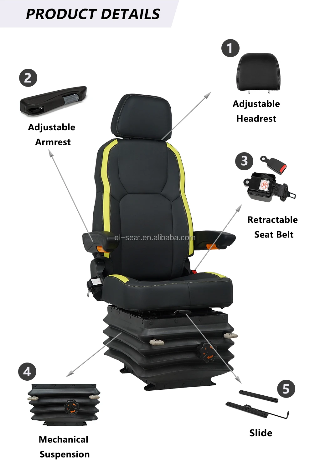 This seat is our heavy-duty seat specially designed for rough roads, and can be applied to heavy construction machines, ships, trains, and trucks. The back support ability effectively helps the operator reduce the pressure of long working hours. The bottom adopts our self-made J07 mechanical suspension shock absorption system, which can ensure sufficient shock absorption effect while avoiding the problem of air source. Armrests and seat belts or any custom needs will be implemented. | ||