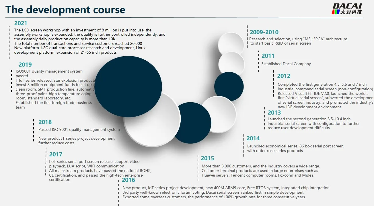 Guangzhou Dacai Optoelectronic Technology Co., Ltd. was established in 2011 with a registered capital of 10 million yuan and is headquartered in Yushu Industrial Park, Guangzhou High-tech Industrial Development Zone. The company has 5,000 square meters of intelligent office space. It is a high-tech enterprise integrating R&D, production, manufacturing and sales. It has a number of scientific and technological inventions, utility model patents and software copyrights. The company always adheres to market demand as the guide, strictly in accordance with the ISO9001:2015 quality system standards, and invests a large amount of research and development funds every year to develop technologically advanced products.