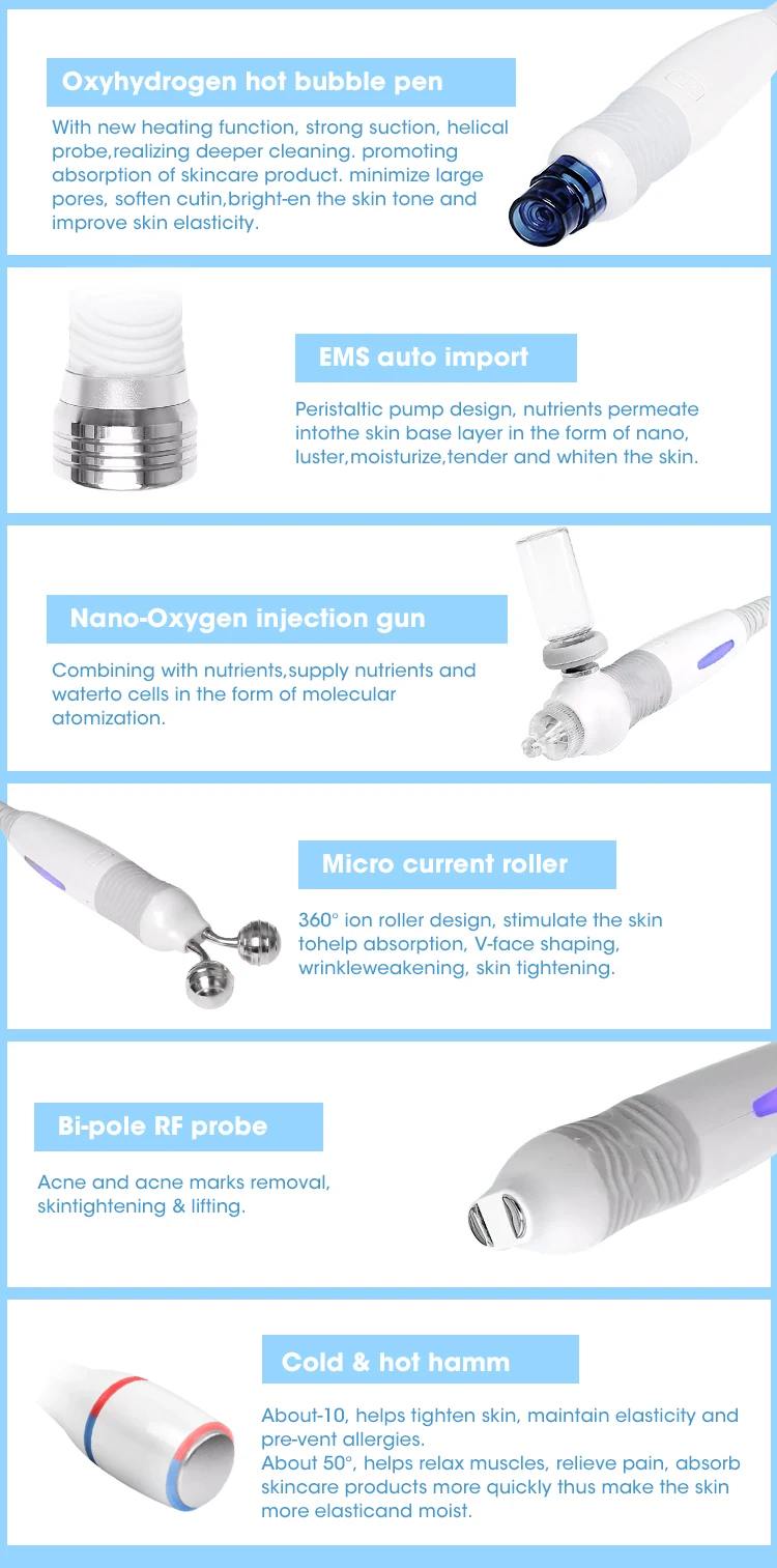 This equipment combines technologies of RF, EMS, Microcurrent, Oxygen injection, Oxyhydrogen hot bubble cleaning as well as Cold & hot hammer to achieve the perfect effects of skin firming, lifting, cleaning whitening, and moisturizing, wrinkles and dark circles removal, etc. | ||||||||