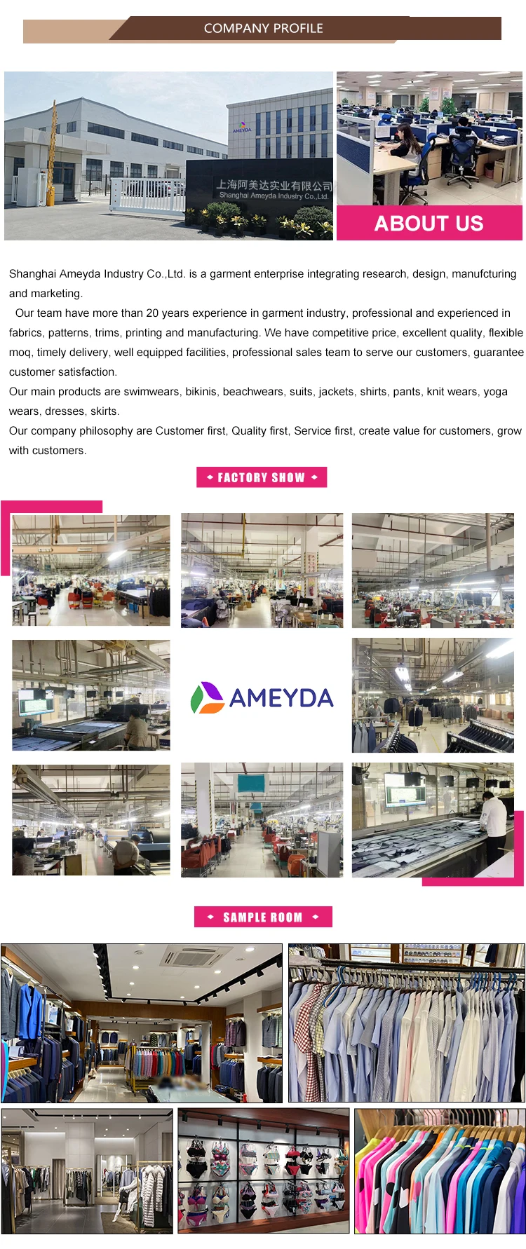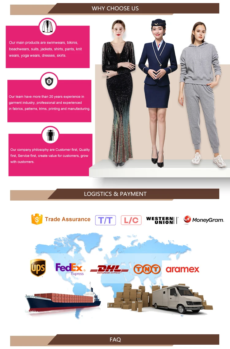 8.Why choose us? High quality products; Ability of develop new designs; Professional and experienced pattern makers, fabric and trim sourcing, workers, quality control and well equipped facilities.