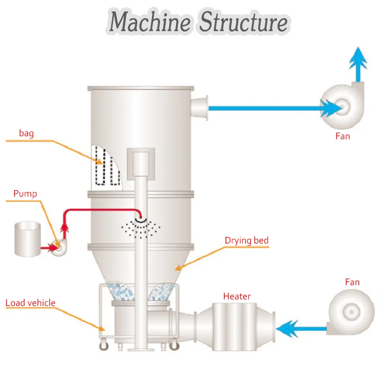 1.Because of powder Granulation, the fluidity is improved and the dust is reduced; 2.Because of powder Granulation, its solving property is improved; 3.The mixing, Granulation and drying can be completed inone step inside the machine; 4.The operation of equipment is safe because the anti static filtering cloth is adapted; 5.The operating personnel can not be damaged if explosion take place because there is releasing hole.
