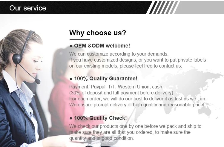5:How about the sample time?What is the payment? Sample time:3~10days after order & samples confirmed. T/T,30% deposit, and balance is after the order is finished. Also we accept the PAYPAL, Western union.