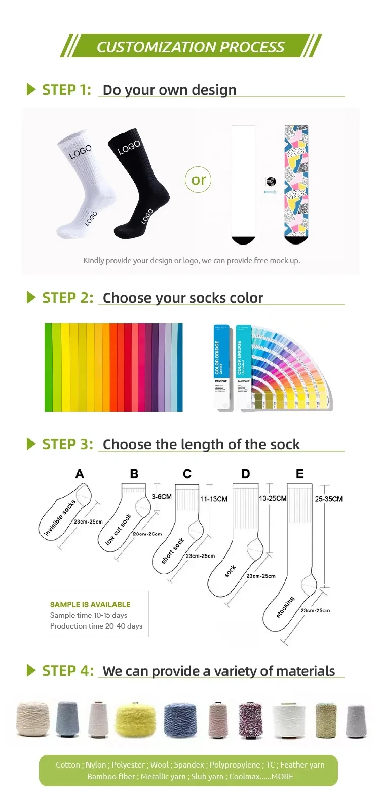 Q4. How about your sample fee and sample time? - For our in-stock socks,we can provide 1-3 pairs as sample to you for free and you only need to pay for the shipment cost. - For customized socks,it takes $50-100 each design/size/color with shipment cost according to your requirements. But it is refundable after order taken. - OEM sample time is about 5-7 days after design confirmed.