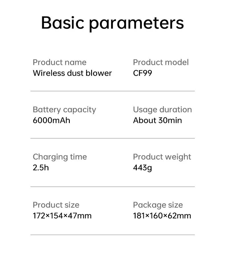 Accessories | Electric Air Duster*1 USB Cable*1 Nozzle*6 Use Manual*1 |
