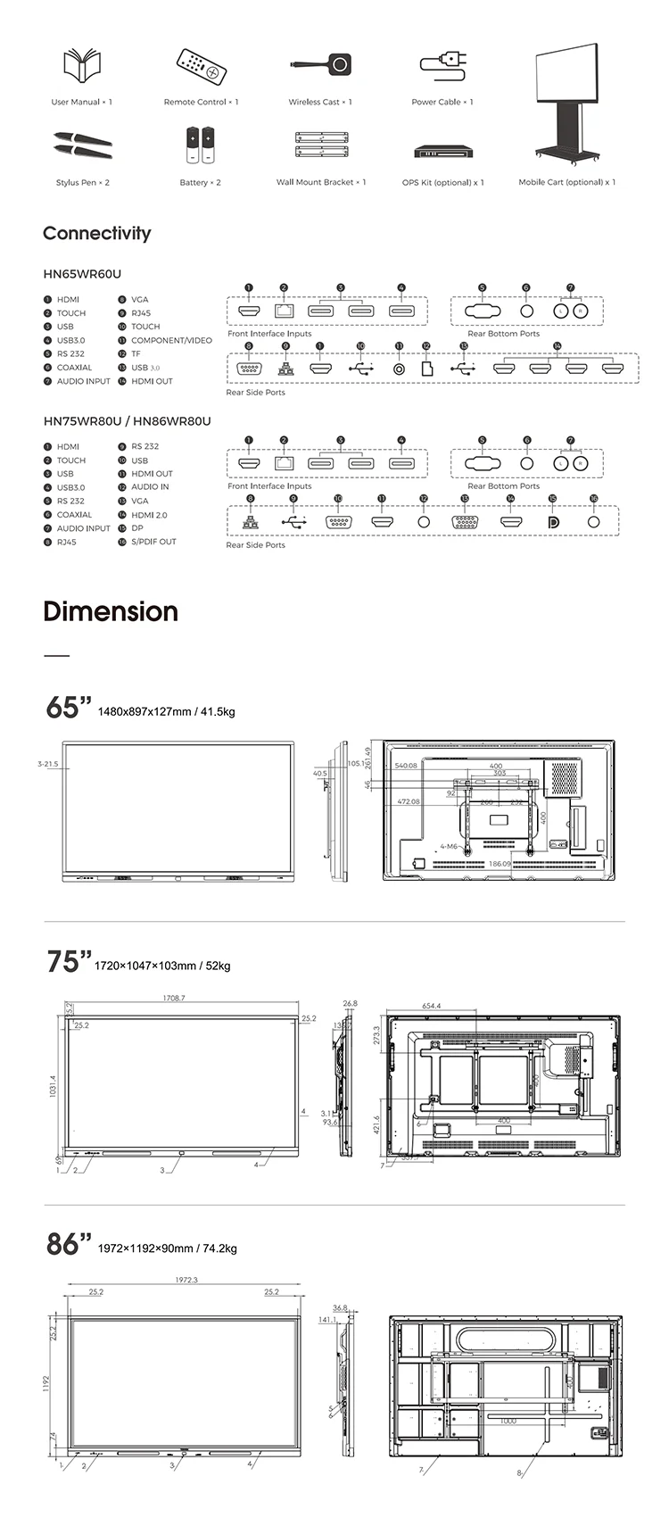 OPS Input Interface | USB3.0*2, USB2.0*4, MIC Audio*1, COM*1(Option) | ||||||